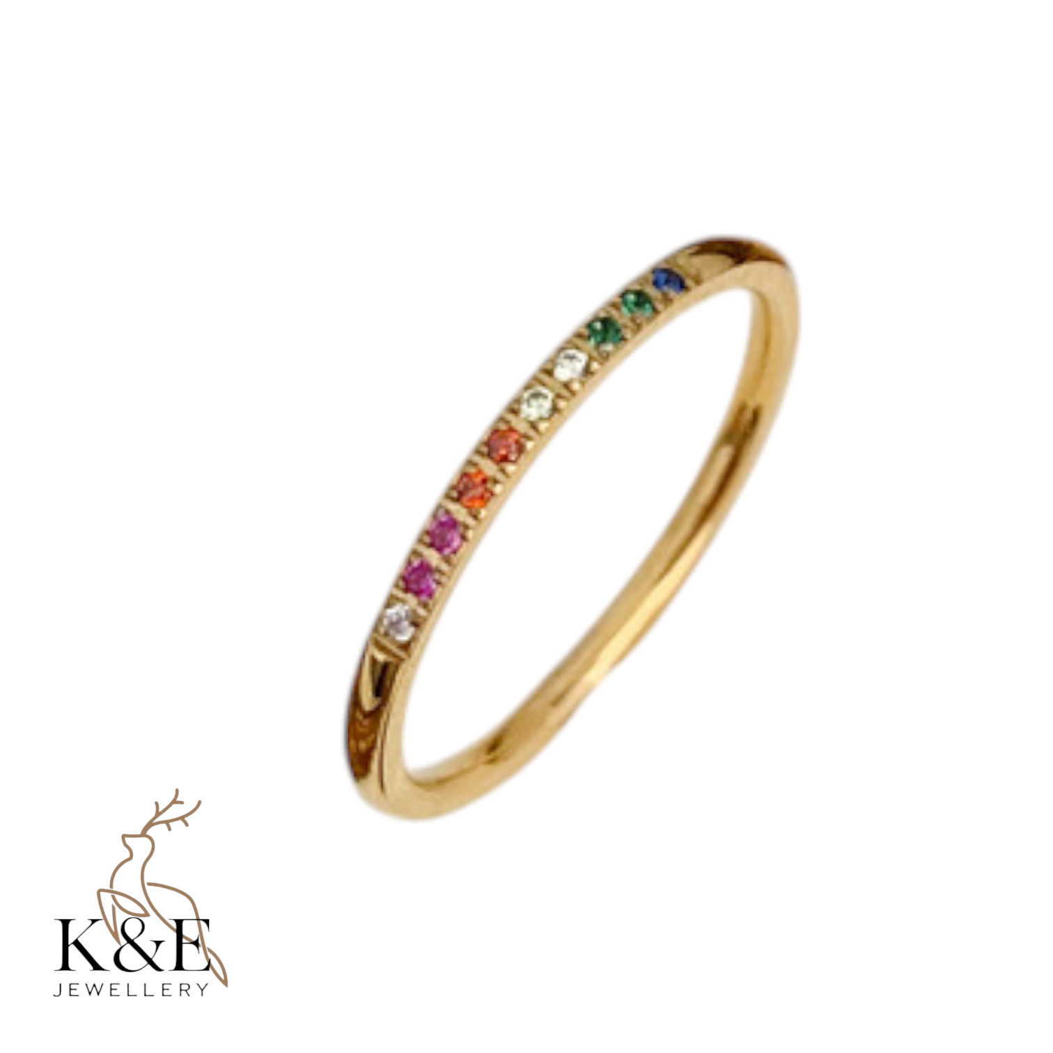 Introducing the thin rainbow CZ ring from KE Jewellery – a sleek stacking band that brings vibrant colour to everyday styling. This slim and elegant ring is adorned with a continuous row of sparkling multi-coloured cubic zirconia stones in a full spectrum of hues. Designed to be worn solo for subtle brilliance or paired with other bands for a layered look, it’s perfect for adding a pop of colour to your jewellery rotation. The minimalist profile makes it comfortable for daily wear, while the rainbow stones catch the light and draw attention in all the right ways. Whether you’re dressing up for a special occasion or elevating your daily look, this rainbow CZ ring is a versatile and playful addition to your collection.