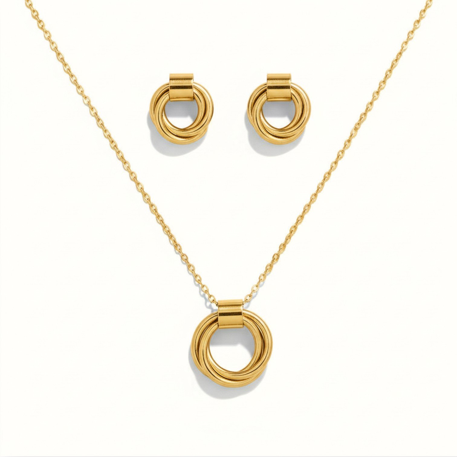 This exquisite Trilogy set features a distinctive circle pendant inspired by the iconic trilogy ring motif, symbolising unity, harmony, and style. The advanced gold plating not only adds a lustrous finish but also enhances resistance to tarnish, water, and daily wear, ensuring effortless glamour that lasts.