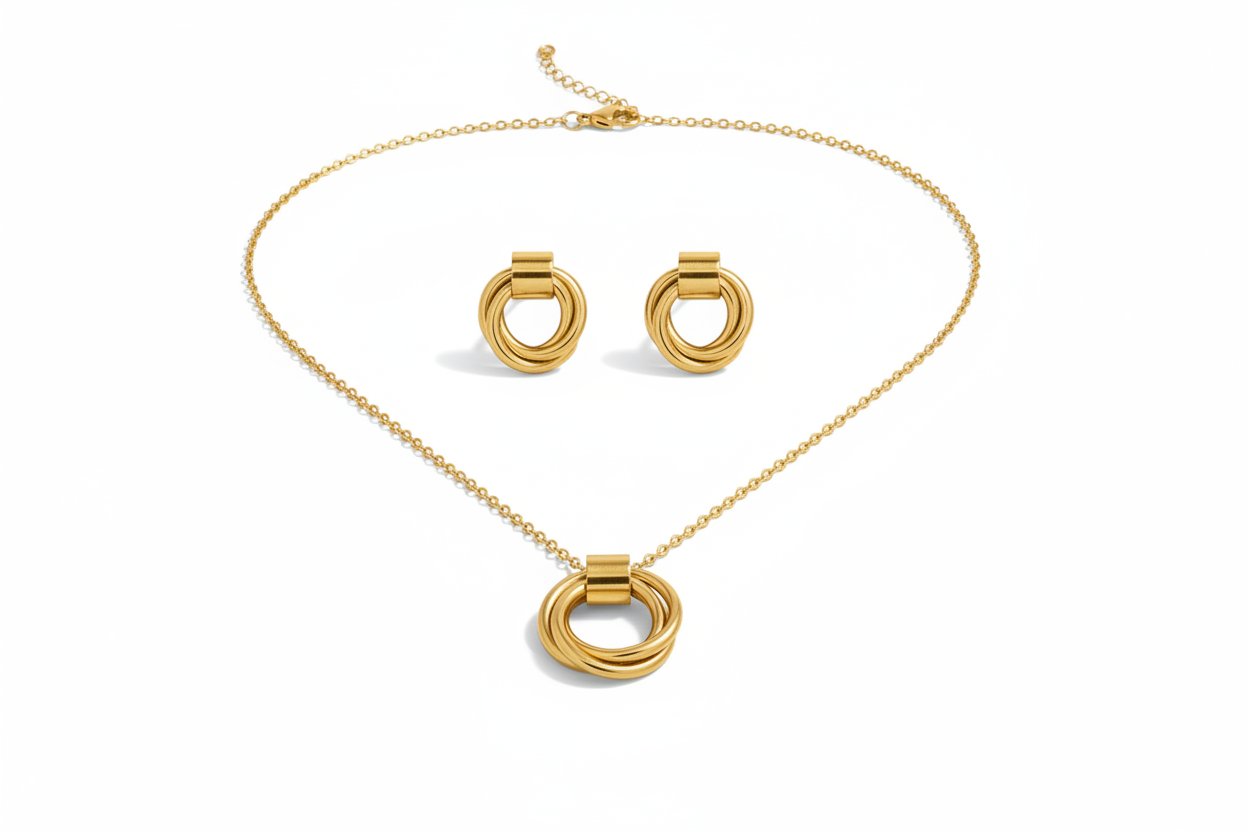 Introducing the K&E Jewellery, a timeless fusion of classic design and modern sophistication. Meticulously crafted from durable 304 stainless steel and lavishly finished with rich 18K gold plating, this set radiates luxury and lasting shine perfect for casual wear, vacation days, or elegant evenings.