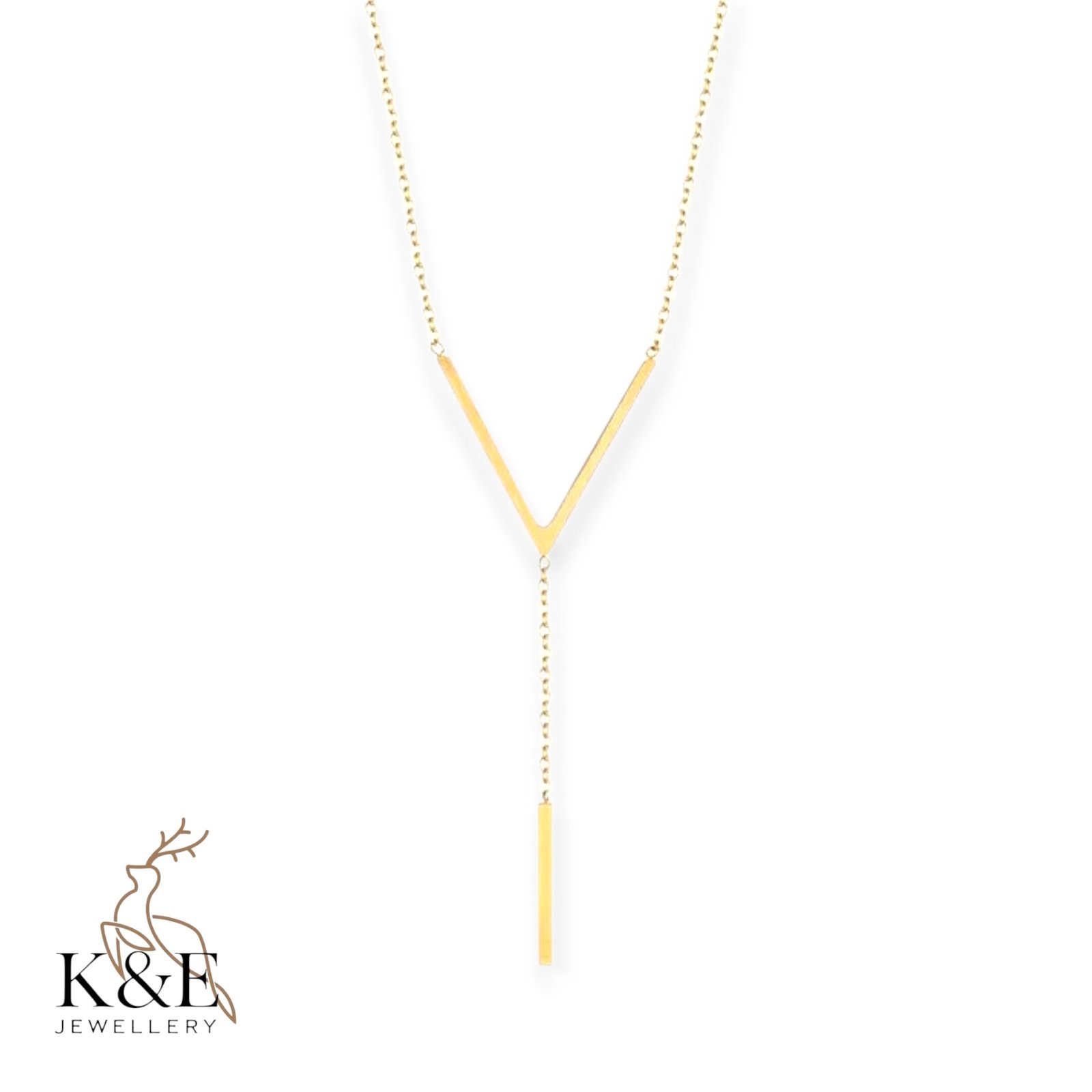 • V-shaped pendant that frames the collarbone and adds visual interest